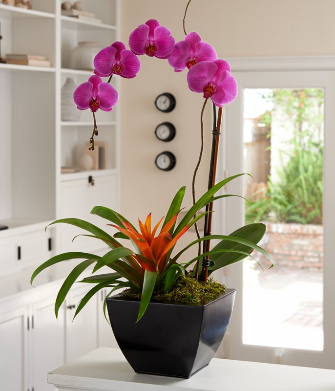 "A stunning color of orchid, and a profuse number of blossoms--even more than the picture. However, the orange bromeliad was not nearly as prominent as in the picture, so the stunning orange/pink combination was not as vivid as I had expected. But our daughter-in-law loved it."