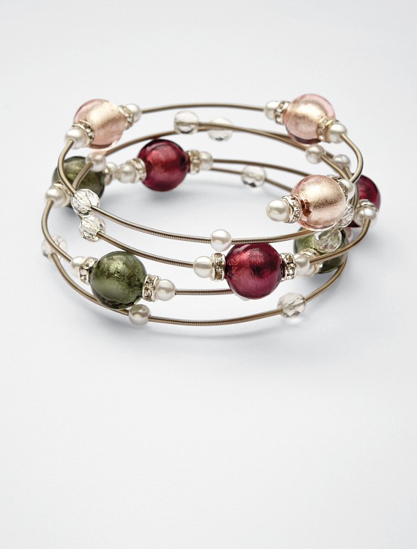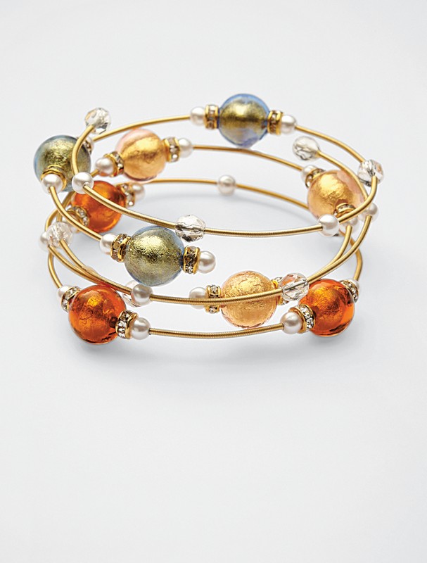 This bracelet is made on the island of Murano, Italy, world-renowned for its glass blowing artisans. The trio of spring-wire bangles features mouth-blown glass hearts painted on the inside in metallic finishes, clear glass rondelles and glass pearls.