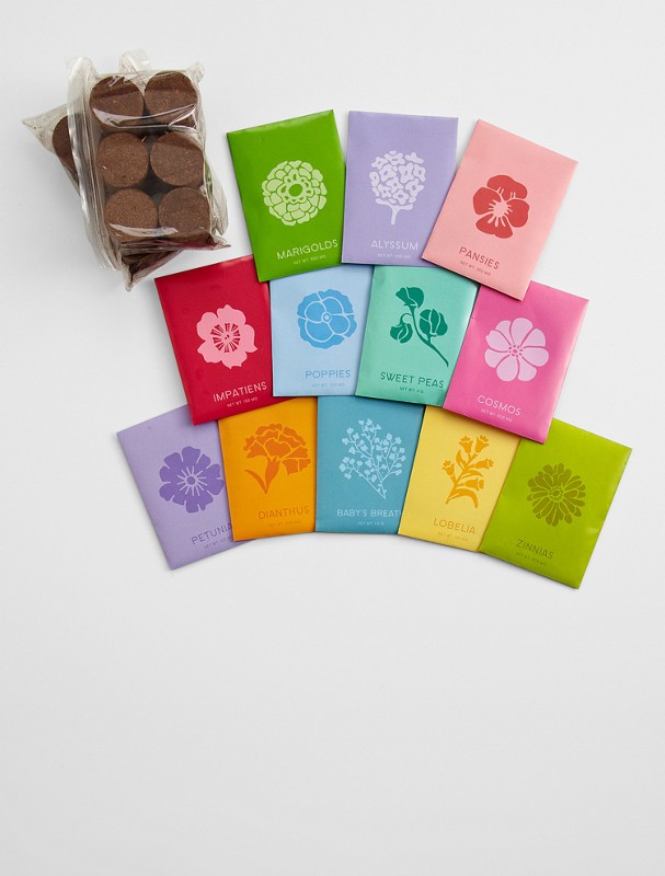 • seeds include petunias, marigolds, pansies, lobelia, alyssum, zinnias, impatiens, baby's breath, dianthus, cosmos, poppies and sweet peas