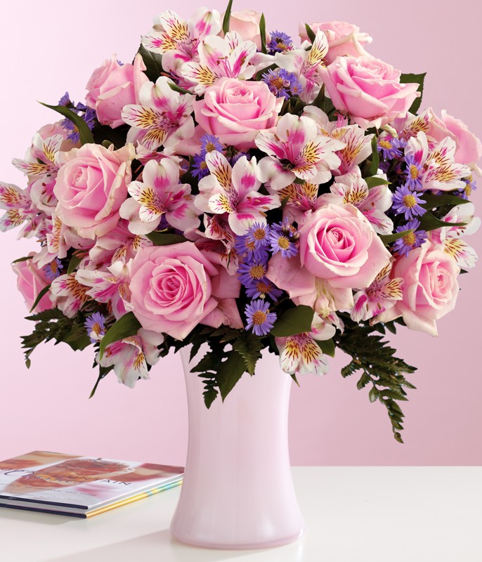 Know someone who looks pretty in pink? Then send them Deluxe Mom's Reward, a "powered by pink" bouquet of 8 fresh cut pink roses, Peruvian lilies, asters and more. And pink roses represent elegance, and are a great way to communicate thanks and admiration.